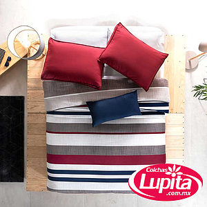Edredón inspirado en el espíritu urbano de las grandes ciudades. Este diseño le dará un toque gráfico a tu recámara, se imprimieron texturas sobre las franjas de color rojo y gris, que junto con su segunda vista brindarán un look contemporáneo a tu decoración. Juego de edredón doble vista.
