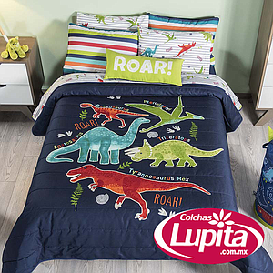 Lleva a la recámara un toque de aventura prehistórica, a tu pequeño le encantará. Juego de edredón con especialidad de tinta que brilla en la oscuridad en primera vista y segunda vista estampada.
