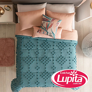 Haz de tu cama el punto focal de tu habitación con este increíble edredón con pompones que le dará un toque fresco y femenino por su combinación de colores turquesa y rosa en conjunto con sus cojines de inspiración tropical.