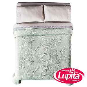 El color verde salvia es perfecto para crear ambientes relajados y acogedores, apuesta por ésta tendencia aplicada en una tela especial con capitonado de hojas. Edredón MAT vista. Calidad premium por su textura velvet súper suave.